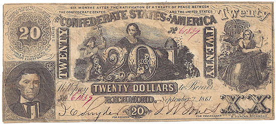 | T20 | CC2446 | CSA $20.00 Note (Industry with Cupid and Beehive, Female with Anchor, Alexander H. Stephens). Period Counterfeit CT20/142 Serial Letter 6 and 2 Series. Note circulated as genuine. Counterfeiter not identified. VF-XF. |