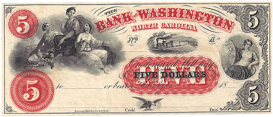 | CC2481 | $5.00 Note The Bank of Washington, North Carolina 18--. Small Train (center), Three Females (left), Female (right). Very bright Red and Black note remainder Unsigned, Unissued, Uncirculated. |
