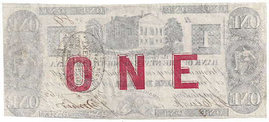 | CC2500B | $1.00 Note Bank of the State of South Carolina 1862. Old State House (center), female figures (left and right), State Seals (bottom center). Large red ONE on the reverse. The note was redeemed by the State in 1880 and cut cancelled. The cancellation handstamp is on the face of the note XF. |