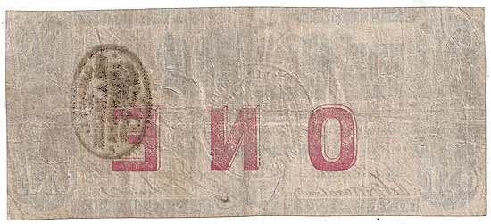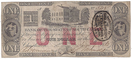 | CC2500C | $1.00 Note Bank of the State of South Carolina 1862. Old State House (center), female figures (left and right), State Seals (bottom center). Large red ONE on the front. The note was redeemed by the State in 1880 and cut cancelled. The cancellation handstamp is on the face of the note VF. |