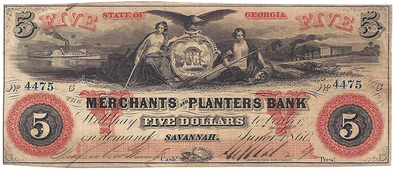 | CC2518 | $5.00 Note Merchants and Planters Bank of Savannah, Geo 1860. Large Scene Justice and Libery with Eagle and the Georgia State Seal flanked by a Steamboat and a Train VF. |