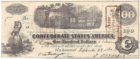 | T40 | CC2537 | CSA $100.00 Note (Train with Diffuse Steam and Milkmaid) Subtype Cr-298, Paterson, September 23, 1862 date. No Watermark. Issued at Montgomery backstamp 20 NOV 1862, and Interest PAID at Jackson, Montgomery, Augusta backstamps VF-XF. |