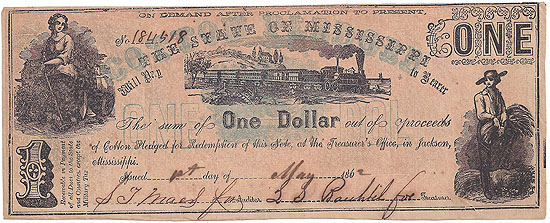 | CC2545 | $1.00 Note The State of Mississippi (Cr-25B) "Cotton Pledged" May 1st 1862. Train (center), Seated Industry (top left), Farmer (bottom right), Underprint in Light Blue. Small acid ink erosion in the bottom right signature sealed from behind. Scarce note with the May 1st 1862 date XF. |