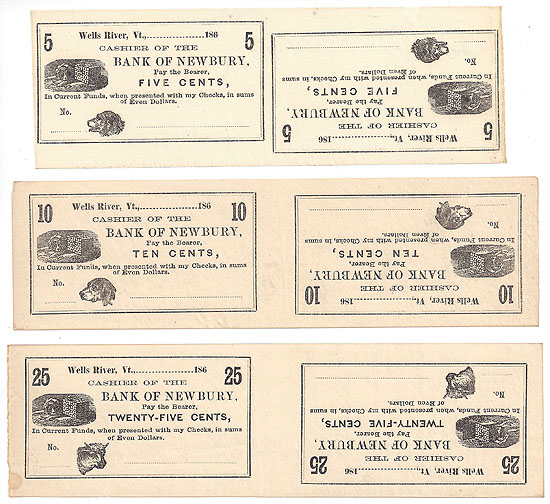 | CC2546 | 5c, 10c, 25c Fractional Notes in 3 Pairs with the pairs upside down with respect to each other. Bank of Newbury (Wells River, Vermont) dated 186-. The three pairs have the same design (dog guarding chest and a separate larger dog's head) with the only difference being the denomination. Unsigned, Unissued, Uncirculated from the 1860's. |