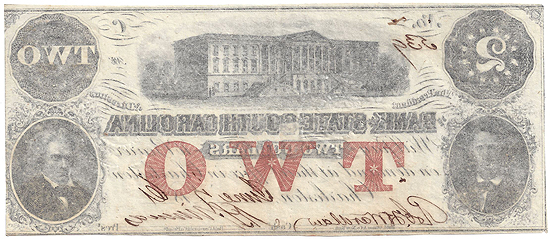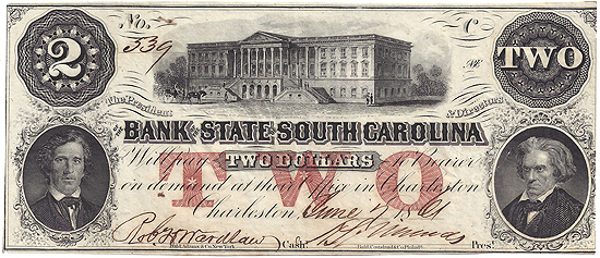 CC2557 | $2.00 Note Bank of the State of South Carolina 1862. South Carolina State House (center), Male Portrait (left), John C. Calhoun (right). The note was redeemed by the State in 1880 and cut cancelled VF-XF. |