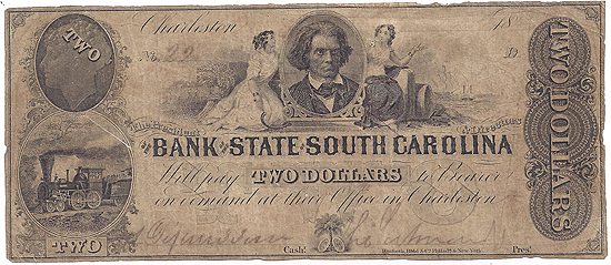CC2558 | $2.00 Note Bank of the State of South Carolina 18--. Portrait of John C. Calhoun flanked by Agriculture and Commerce (center), classical female bust (top left), train (bottom left). Unsigned, Unissued.The note was redeemed by the State in 1880 and cut cancelled Fine. |