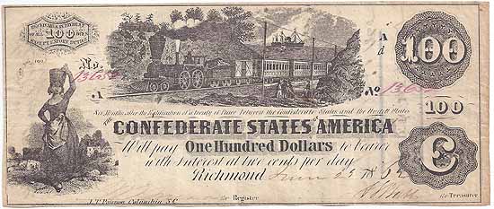 T39 | CC2567 | CSA $100.00 Note (Train Straight Steam and Milkmaid) Subtype Cr-291, Paterson, Large Letter below "A." Interest PAID to Jan 1, 1863 backstamp and Interest Paid manuscripts 1864 and 1865 VF-XF. |