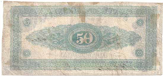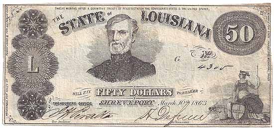 CC2599 | $50.00 Note The State of Louisiana (Cr-12) 1863. General Leonidas Polk (center), Seated Liberty with Spear and Shield lower right). Shreveport F-VF with a very light stain at the top on the back only. |