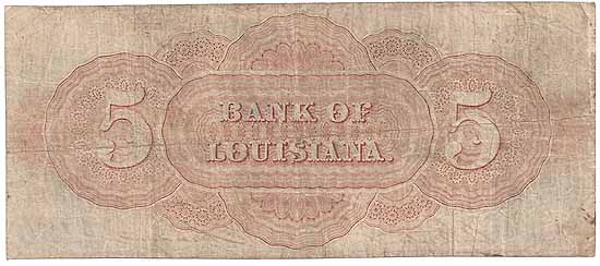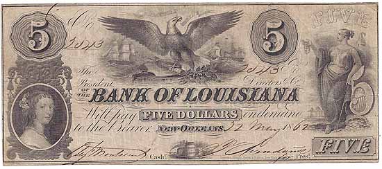 | CC2603 | $5.00 Note Bank of Lousiana (New Orleans) 1862. Large Eagle and Sailing Ships (center), Female Portrait (lower left), Standing Liberty (right), Barrels (bottom center) F-VF. |