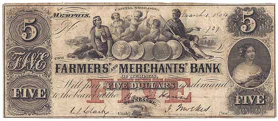 | CC2608 | $5.00 Note The Farmers' and Merchants' Bank (Memphis) 1854. Indian Maid and Frontiersman with Cupids and Five Coins (center), Female Portrait (right), Steam Boat (bottom center) F-VF. |