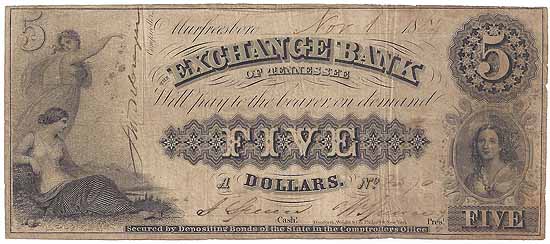 CC2612 | $5.00 Note Exchange Bank of Tennessee (Murfreesboro) 1864. Two Female Figures (left), Female Portrait (right). Fine+. |