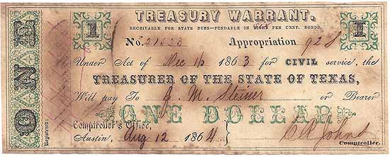 | CC2626 | $1.00 State of Texas (CSA) Treasury Warrant (Cr-4A) for Civil Service Aug 12, 1864. Much scarcer variety where the bond interest rate was changed from eight to six per cent in red ink XF. |