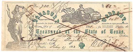 | CC2627 | State of Texas (CSA) Treasury Warrent (Cr-43) for $68.00 for Milirary Service Febry 17, 1863. Standing Armed Indian Maid (left), Seated Ceres with Grain and Farm Tools and a Steamboat in the background (center) VF-XF Pen-Cancelled, |