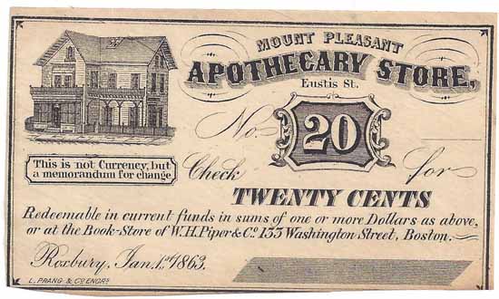 | CC2643 | 20c Fractional Note Mount Pleasant Apothecary Store Merchant Script Roxbury, Massachusetts 1863. The store is pictured on the note. Uncirculated. |
