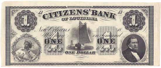 | CC2646 | $1.00 Note Citizen's Bank of Louisiana (New Orleans) 18--. Sailboat (center), Farmer (lower left), President Millard Fillmore (lower right). Remainder Unsigned, Unissued, Uncirculated. |