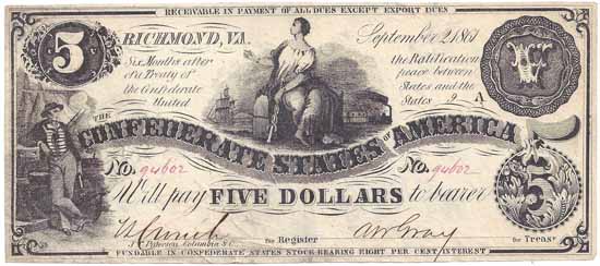CT36 | CC2649 | Contemporary Counterfeit CSA $5.00 Note (Commerce Seated on Cotton Bale, Sailor) Subtype Cr-CT36/274. Peterson Imprint, Plate 9A, Plain Paper. Written serial numbers and written signatures. Identified as counterfeit by the absence of a ship's rigging line that should go behind the sailor's head at the left. Excellent counterfeit that most certainly circulated as genuine VF. |