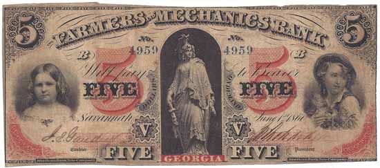 CC2651 | $5.00 Note The Farmers and Mechanics Bank (Savannah) 1860. Liberty (center), Female Child Portrait (left), Male Child Portrait (right) Fine. |