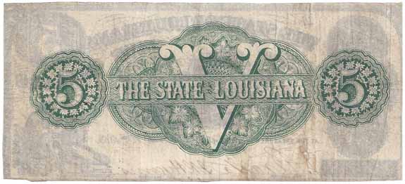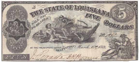 | CC2690 | $5.00 Note The State of Louisiana (Shreveport) 1863 (Cr-14). "South Striking Down the Union" (center), Pelican with Young (left), Bearded Man with Water Jug (lower right) VF. |