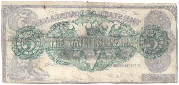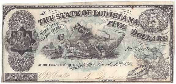 CC2692 | $5.00 Note The State of Louisiana (Shreveport) 1863 (Cr-14). "South Striking Down the Union" (center), Pelican with Young (left), Bearded Man with Water Jug (lower right) XF. |