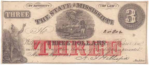 | CC2705 | $3.00 Note The State of Mississippi (Cr-42) May 1st 1864. Soldier on Guard with State Symbols and Cannon with an Eagle in the Tree (center), Indian Brave with Bow and Arrows (lower left) AU. |