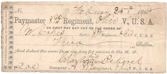 Union Civil War Sutler's Script - Payment note for $2.00 to W. Copes Sutler of the 89th Regiment Ohio Volunteers