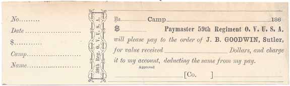 | CC2719 | Union Civil War Sutler's Script - Payment Note 186- to J. B. Goodwin Sutler of the 59th Regiment O. V. U. S. A. (Ohio Volunteers). Unissued and AU complete. |