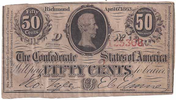 | T63 | CC2742 | CSA 50c Fractional Note (Jefferson Davis) Subtype Cr-486 1st Series, No Flourishes above the Plate Letter VG-F. This variety with no flourishes above the plate letter is described by Fricke as a scarce variety with a rarity factor of 8 / 10. |