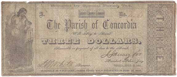 CC2744 | $3.00 Note The Parish of Concordia (Vidalia) 1862. Standing Female Figure (left) Fine+. |