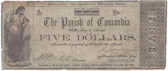 | CC2745 | $5.00 Note The Parish of Concordia (Vidalia) 1862. Standing Female Figure (left) Fine. |
