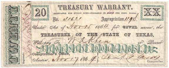 | CC2765 | $20.00 State of Texas (CSA) Treasury Warrant (Cr-26-2) for Civil Service Nov 17, 1864. Interest rate changed from eight to six percent in RED ink. The back is blank. F-VF. |