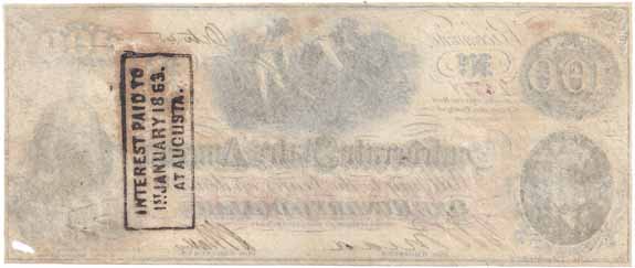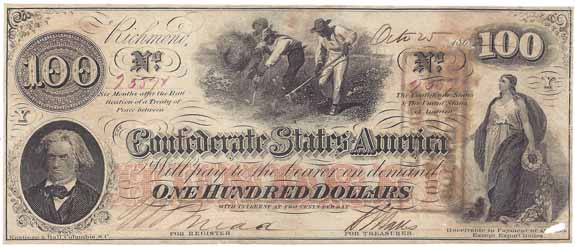 | T41 | CC2770 | CSA $100 Note (Slaves Hoeing Cotton, John C. Calhoun, Confederacy Personified) Subtype Cr-316A Plain Paper, Scroll 2, Frame stops at "Except." Interest PAID at August back stamp. Choice AU with an erosion hole at the lower right corner. |