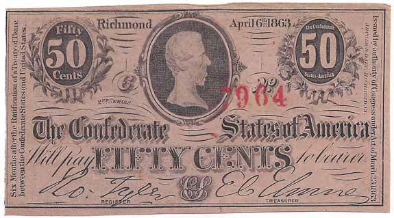TT63 | CC2775 | CSA 50c Fractional Note (Jefferson Davis) Subtype Cr-487 2nd Series, Flourish above the Plate Letter XF. |