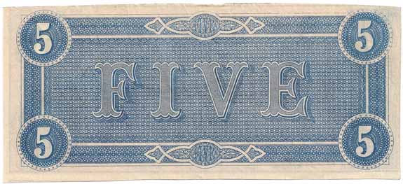 | T69 | CC2779 | CSA $5.00 Note (Capitol at Richmond, Christopher G. Memminger) Subtype Cr-560 Series 2 "Engraved by Keatinge & Ball, Columbia, S.C." and "Lithogd by Evans & Cogswell" XF-AU. |