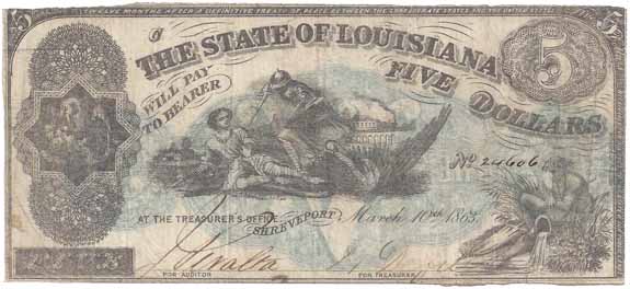 | CC2783 | $5.00 Note The State of Louisiana (Shreveport) 1863 (Cr-14). "South Striking Down the Union" (center), Pelican with Young (left), Bearded Man with Water Jug (lower right) F-VF. |