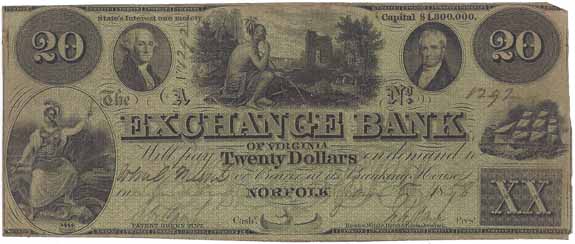 | CC2785 | $20.00 Note The Exchange Bank of Virginia (Norfolk) 1858. Indian Brave Scene flanked by George Washington portrait at left and another male portrait at right (top center), Virginia State Seal (lower left), Sailing Ship (right), Indian in Canoe (bottom center) F-VF. |