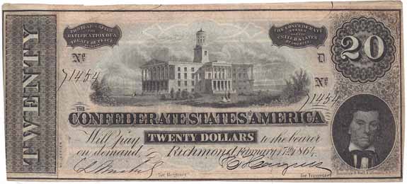 T67 | CC2828 | CSA $20.00 Note (Capitol at Nashville, Alexander H. Stevens) Subtype Cr-510 VI Series, Two Flourishes VF-XF. |