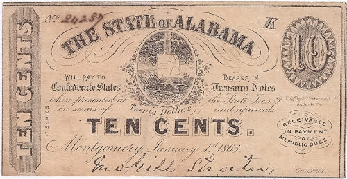 CC2837 | 10c Fractional Note The State of Alabama (Cr-9) 1863. Alabama State Seal (center). 1st Series with larger Plate Letter XF. |