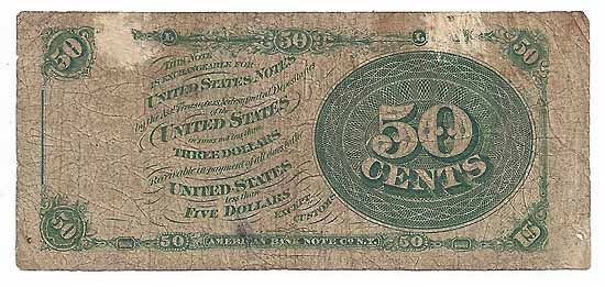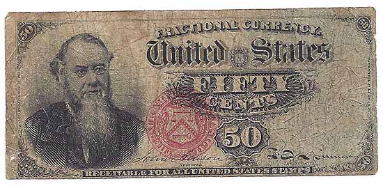 USA 50c Fractional Currency Fourth Issue Type 2 1869-1875. Portrait of Edwin M. Stanton, Secretary of War under Lincoln. Old mounting marks on the back. VG-Fine. | $20.00 |