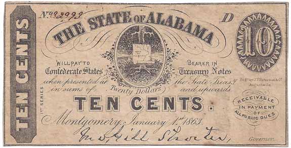 CC2842 | 10c Fractional Note The State of Alabama (Cr-9) 1863. Alabama State Seal (center). 1st Series with larger Plate Letter VF-XF. |