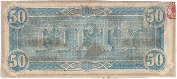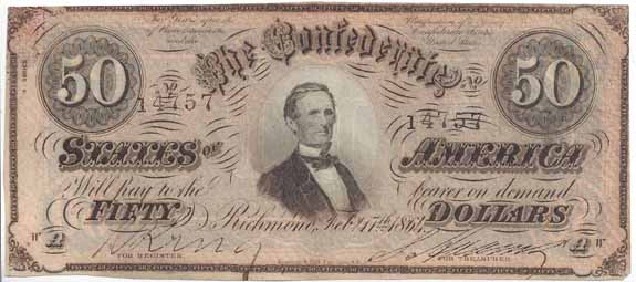 | T66 | CC2849 | CSA $50.00 Note (Jefferson Davis) Subtype Cr-499 4 Series, No Flourish over "CON" VF. |