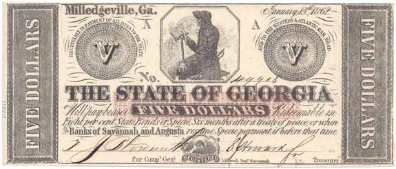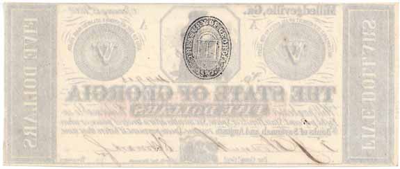 | CC2859 | $5.00 Note State of Georgia (Cr-5) 1862. James Oglethorpe (center) and Georgia Coat of arms (State Seal) (bottom center). Black Treasury Seal on the back. Printed name in the left margin "Deall" which is most likely the name of one of the engravers or printers. Uncirculated. |