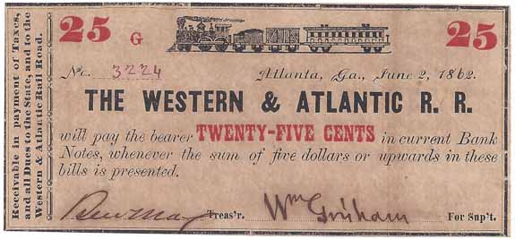 | CC2870 | The Western & Atlantic R. R. 25c Fractional Note (Atlanta) 1862. Train (top center) AU. The Western and Atlantic Railroad in Georgia was the railroad of the Great Locomotive Chase. |