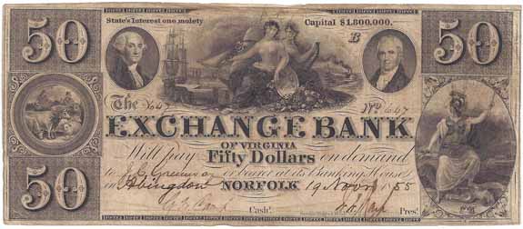 | CC2877 | $50.00 Note The Exchange Bank of Virginia (Norfolk) 1855. Two Seated Female Figures with Sailing Ships (Navigation and Prosperity) flanked by George Washington and another Male Portrait (center), Men with Farm Animals (left), Warrior Vanquishing Foe (right) VF. |