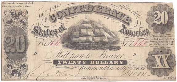 | T9 | CC2880 | CSA $20.00 Note (Sailing Ship). Subtype Cr-33 Serial Letter "D", Large "XX", Printed "For Treas", Bond Paper F-VF. |