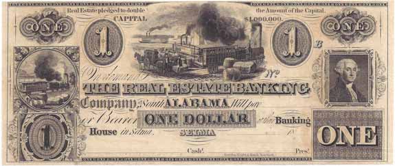 | CC2884 | $1.00 Note The Real Estate Banking Company of South Alabama (Selma) 18--. Dock Scene with Steamboats and Train (top center), Train (left), George Washington (right). Unsigned, Unissued, Uncirculated. The Real Estate Banking Company of South Alabama in Selma was a completely fraudulent banking concern about 1860. Their notes circulated until the company collapsed when the owners apparently got caught in their fraudeulent scheme and fled the scene. |