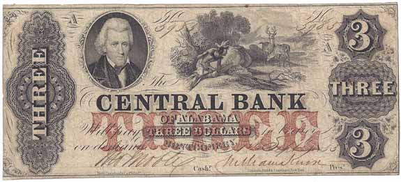 | CC2885 | $3.00 Note The Central Bank of Alabama (Montgomery) 1853. Indian Brave Hunting Deer with a Flintlock (top right), Andrew Jackson (top left). F-VF. |