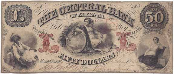 CC2886 | $50.00 Note The Central Bank of Alabama (Montgomery) 1850. Seated Liberty with Staff and Liberty Cap and Shield with Alabama State Seal (central), Slave with Cotton (bottom left), Seated Female Figure (lower right) F-VF. |