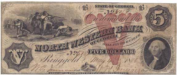 | CC2892 | $5.00 Note North Western Bank of Georgia (Ringgold) 1858. Battle of Bunker Hill (top left), George Washington (bottom right), Swimming female (bottom center) Fine. |