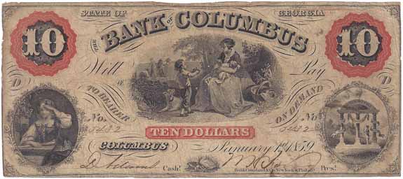 | CC2893 | $10.00 Note The Bank of Columbus 1859. Mother with Children and a Dog in a Farm Scene (center), Seated Female (lower left), Georgia State Seal (lower right) Fine. |