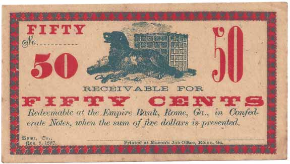 | CC2901 | Empire Bank of Rome, Georgia, 50c Fractional Note 1862. Dog Guarding Chest (center). Unnumbered, Unsigned, Unissued, Uncirculated. |